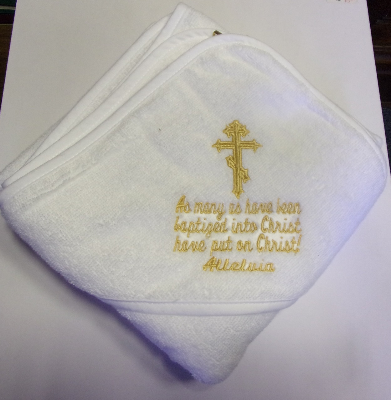 Hooded terry cloth towel with white trim and gold embroidered 3-bar cross and lettering.