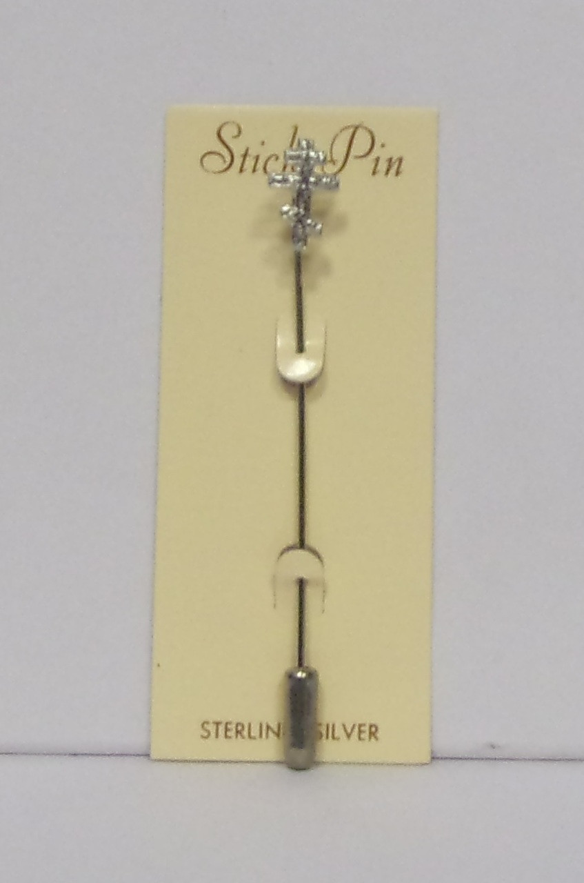 Sterling silver stick pin with 3-bar cross.