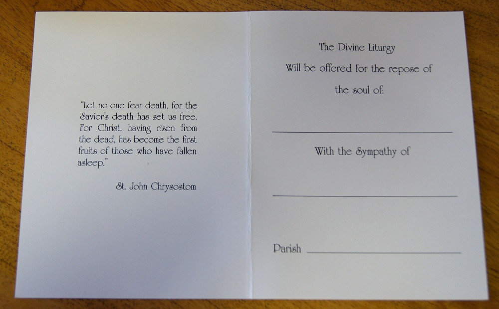 Inside says: The Divine Liturgy will be offered for the repose of the soul of: _____________ With the Sympathy of _________________ Parish ___________