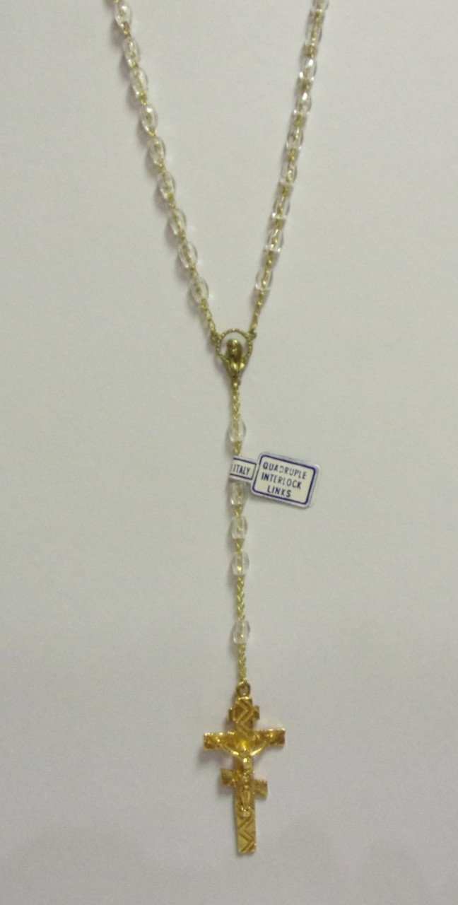 Gold-tone cross hangs from a clear beaded chain